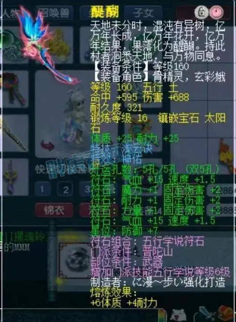 目前,这把武器已经成品,打上了16段太阳石,也熔炼好了。