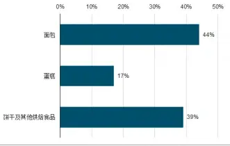 目前我国烘焙行业中,面包所占比重最高,约为44%;其次是饼干及其他烘焙食品,占比约39%;蛋糕占比17%。