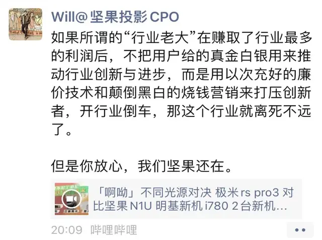 事情的经过比较有意思,起初是一位UP主评测了坚果三色激光产品(坚果N1 Ultra)和”超级混光“产品(极米RS Pro3),在其体验之后,认为三色激光投影的画质和技术更好。很多网友赞同UP主的观点,但也有不少人质疑UP主评测的真实性。后来这个视频被坚果高管看到,并在社媒点名友商打压创新,随后极米公关负责人通过社交媒体回应,从而引发行业热议。