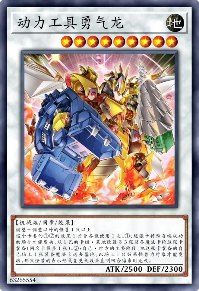 而一旦说起“同调召唤”和“装备魔法卡”,又怎么能少了电动工具龙呢?尤其是现在K社还给动力工具龙套了一个【动力工具勇气龙】的上级马甲。相较于原版动力工具龙的三选一效果,这张勇气能够直接从卡组将最多3张装备魔法卡装备到自己身上。这就直接完成了对【烟玉】的检索。