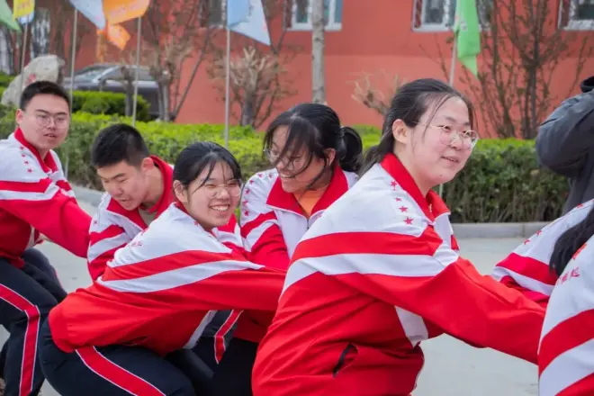 热血拔河为校园增添无限活力,同学们在绳子的两端严阵以待,一声哨响像银瓶乍破,老师学生的呼号和加油助威的声音响彻整个校园。