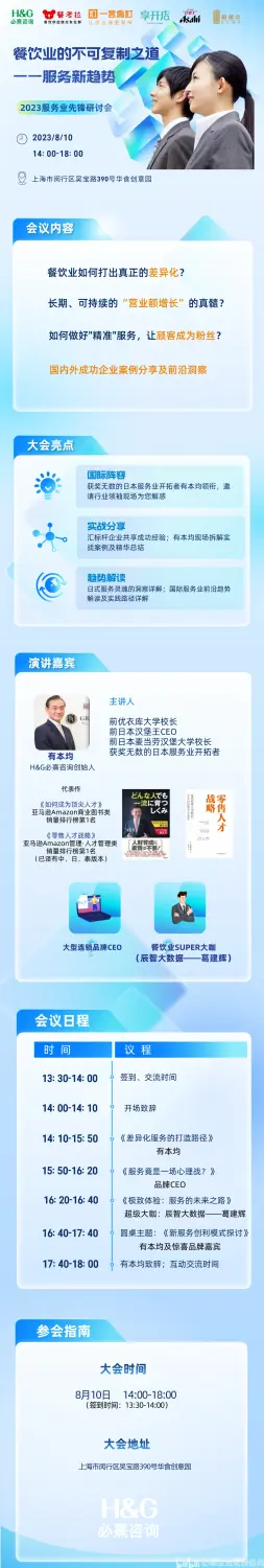 尊敬的各位餐饮人,你是否在为当下的餐饮服务痛点而苦恼?是否在寻找打造差异化服务、提升门店口碑、快速提高营业额、做日式餐饮的答案和解决方案?如果你的回答是肯定的,那么你一定不能错过H&G必熹咨询即将于2023年8月10日下午在上海举办的“2023服务业先锋研讨会”。