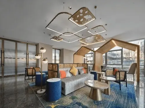 酒店大堂宽敞明亮,大面积的落地玻璃落地窗使得公共空间拥有充足的自然光线,令宾客踏入酒店即感受到明亮和温暖的氛围。酒店接待的区域舒心雅致,设计感的木格栅背景装饰让宾客从办理入住时即倍感愉悦。餐厅和大堂吧采用共享和社交的概念,无阻隔的连通空间同时兼顾宾客用餐、社交的需求;另外,便捷易用的充电插头,也为客人提供了便利的办公环境。