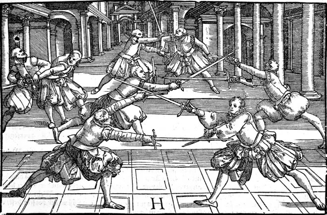 或者你仍旧招架,(剑)从你匕首下刺出,从对手右臂外侧刺其面部,手背朝对手,如图H右上方人所示。在你左臂下略微抬起护手,这样你做好了一次斩击预备动作,然后从你左侧斩对手在前的腿。