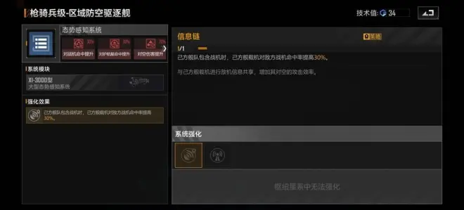枪骑兵防空型和综合型应该是比较常用的,我们先说防空型。防空型对于大部分人来说只是一个挂件,挂什么呢?态势感知系统里的信息链,提升战机打战机的命中率,变相提高输出。因此我们最低的加点就是态势感知系统里的信息链和制导武器闪避率。装甲系统加不加说法不大,小船生存主要依靠闪避,枪骑兵又是前排又缺闪避,几乎就是硬吃伤害,最有效的提高生存能力的方法就是多带前排。