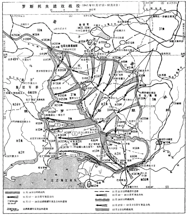 11月17日,苏军南方面军向德军南方集团军群先头部队发起进攻,同日,德军第1装甲集团军也向罗斯托夫发起进攻。期初,南方面军进展缓慢,只有第37集团军进展最快,在4天内前进了30—35公里,而德军也在21日攻陷了罗斯托夫。南方面军继续向前推进,威胁到了第1装甲集团军的侧翼和后方,迫使其停止进攻并抽调部分兵力北上。11月27日,苏军从西北和南向罗斯托夫转入进攻,并于29日收复罗斯托夫,12月2日前出至米乌斯河,在此被法西斯德军预有准备的防御所阻止。罗斯托夫进攻战役是红军在伟大卫国战争中第一个大规模进攻战役,它制止了德军突向高加索的企图,稳定了苏德战场南翼。苏军南方面军牵制了南方集团军群的兵力,使其不能北上增援中央集团军群。德军第1装甲集团军被从罗斯托夫向西击退60—80公里。