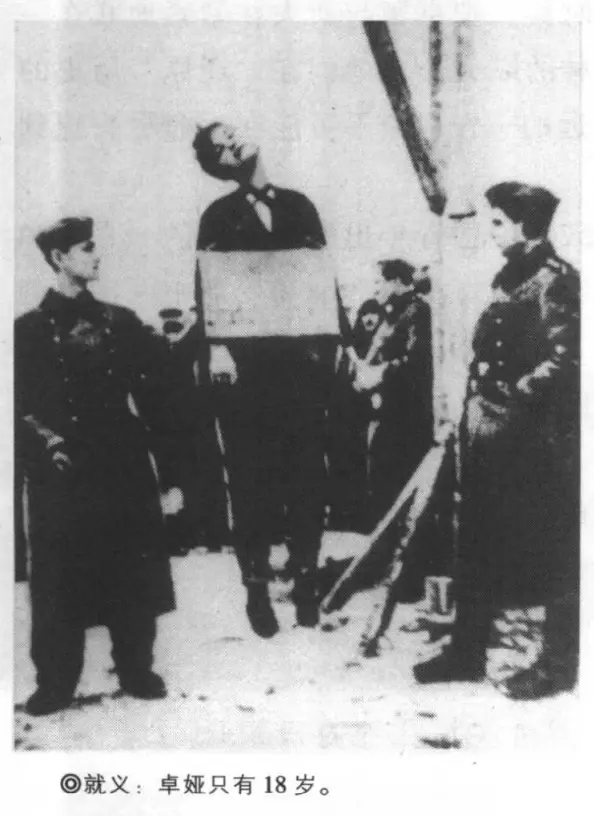 卓娅是莫斯科第201中学的十年级学生,共青团员,战争爆发的那一年她刚18岁。这一年10月,她自愿参加了游击队,奔赴敌后作战。11月的一天,她在莫斯科州韦列亚区彼得里谢沃村割断德军电话线,并烧毁了拴有70多匹骡马的德军马棚;第二天,她在该地准备焚烧拴有200多匹骡马的德军马棚时,不幸被捕。当敌人问她有什么目的时,她坚定地回答说:“消灭你们。”法西斯用尽了各种酷刑强迫她交待出战友和游击队的位置,但卓娅硬是一个字也没有告诉他们。法西斯对卓娅进行了丧心病狂地折磨。11月29日,法西斯将被打得遍体鳞伤的卓娅带上了绞刑架。临刑前,卓娅安慰愁眉苦脸的战友们,对他们说:“嘿,同志们,你们为什么愁眉苦脸地看着我呀?你们应该勇敢起来,战斗吧,打击法西斯强盗,烧死他们,毒死他们!”“我不怕死,同志们,为自己的人民而死,这是幸福啊!”她轻蔑地对强盗们说:“你们现在要绞死我,可是我不是一个人,我们有两万万人,你们不能把我们全部绞死,我的同胞们将为了我向你们复仇。士兵们,现在还不晚,快投降吧,胜利迟早是我们的!”强盗们将她脖子上的套索勒紧,但她继续说:“永别了,同志们!战斗吧,不要怕。斯大林和我们在一起!斯大林一定来到!”年仅18岁的卓娅英勇就义。