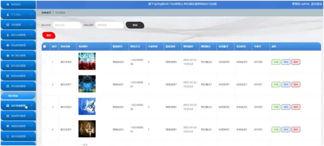 预约查询管理,管理员可在预约查询管理页面查看音乐名称、音乐图片、陪练姓名、联系方式、小时单价、陪练资质、预约时间、预约备注、会员账号、会员姓名、手机号等内容,还可进行修改或删除等操作,如图5-13所示。