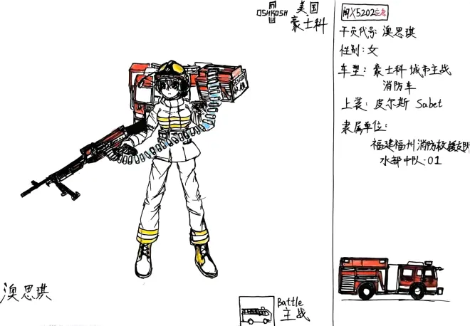 “我是说我们班长……”少女消防员说着,想起什么,对两人挤出勉强的微笑:“我叫澳思琪,是那辆消防车——”她指向远处停在路边闪着灯的豪士科主战消防车,“嗯,我也是人形。”