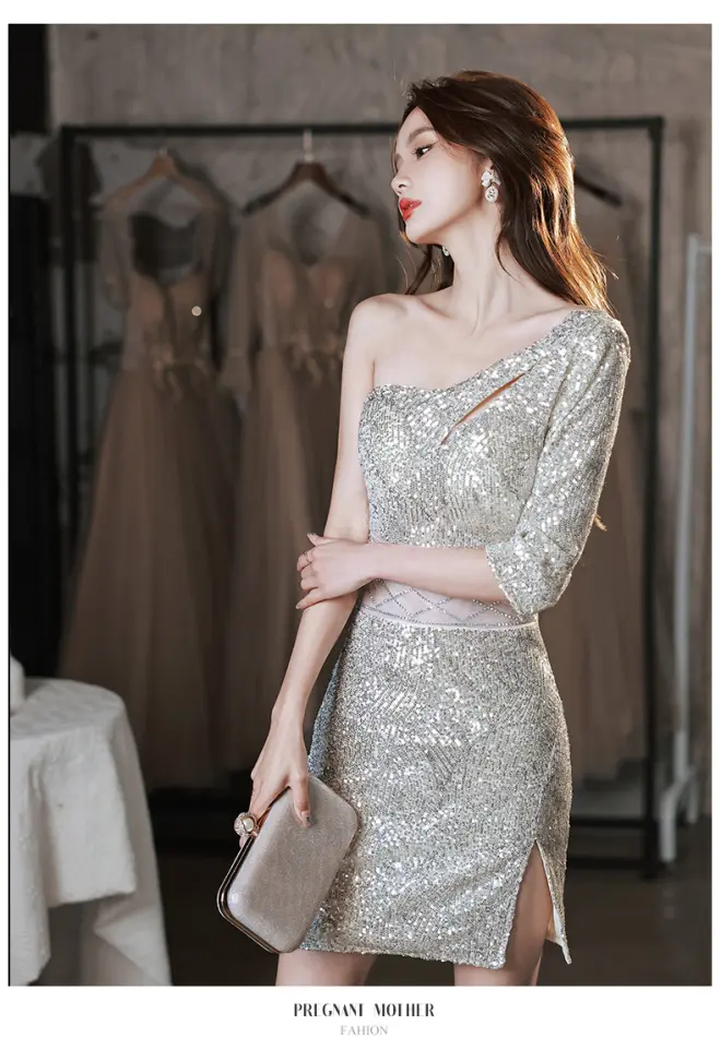 » 小个子晚礼服女2022新款高级质感亮片名媛时尚单肩连衣裙短款性感