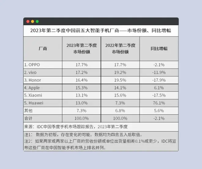 IDC公布二季度中国智能手机市场销量数据,OPPO稳居第一