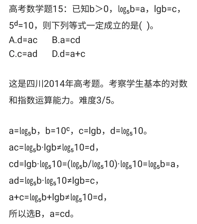高考数学题15:已知b>0,㏒₅b=a,lgb=c,5ᵈ=10,则下列等式一定成立的是( )。 A.d=ac B.a=cd C.c=ad D.d=a+c 这是四川2014年高考题。考察学生基本的对数和指数运算能力。难度3/5。 a=㏒₅b,b=10ᶜ,c=lgb,d=㏒₅10。 ac=㏒₅b·lgb≠㏒₅10=d, cd=lgb·㏒₅10=(㏒₅b/㏒₅10)·㏒₅10=㏒₅b=a, ad=㏒₅b·㏒₅10≠lgb=c, a+c=㏒₅b+lgb≠㏒₅10=d, 所以选B,a=cd。