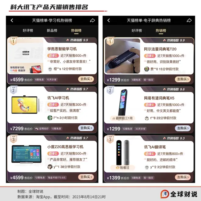 以天猫榜单为例,截至8月14日21时,学习机热销榜中讯飞AI学习机位于第二位,低于学而思智能学习机,而小度学习机则紧跟其后。