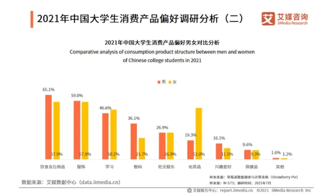 2021年在线消费成为新趋势,调查数据显示,大学生每次线上消费200元以下占65%,购物狂欢节消费600元以下占73%。消费主要用于饮食及日用品,此外还有服饰、学习、数码、社交娱乐、化妆品(女生为主)、兴趣爱好、保健品和其他。