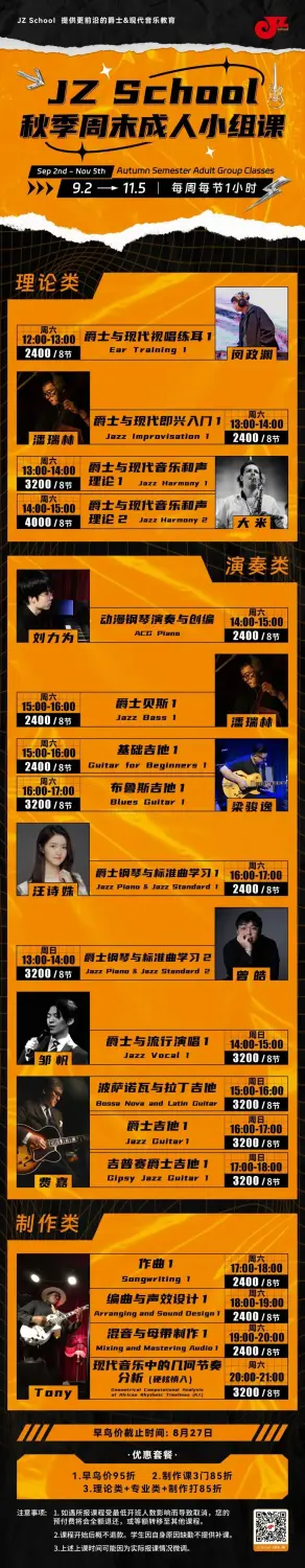 如果你想进一步学习拉丁和波萨诺瓦吉他,别错过费嘉老师的 JZ School 秋季周末小组课波萨诺瓦与拉丁吉他课程!