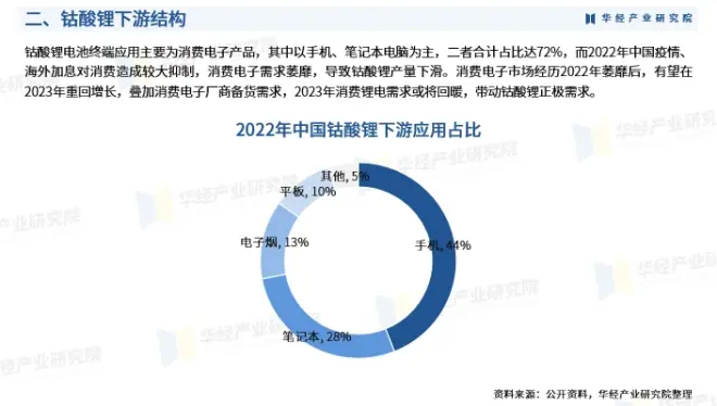 钴酸锂电池为第一代商业化应用的锂电池技术路线,由于其体积能量密度高、倍率性能好,成为消费电子产品核心产品,其主要缺点为成本较高、循环寿命较短。目前钴酸锂主要应用于3C领域,已经存在某些小型锂电领域如移动电源上三元与钴酸锂混用的趋势。未来钴酸锂主要将朝着高电压方向发展,将通过掺杂和表面包覆来提高高电压下钴酸锂的性能。钴酸锂采用“原材料成本+加工成本+毛利”的定价模式,供需双方协商定价,其中料工费占成本比重高达80%左右。钴酸锂电池终端应用主要为消费电子产品,其中以手机、笔记本电脑为主,二者合计占比达72%,而2022年中国疫情、海外加息对消费造成较大抑制,消费电子需求萎靡,导致钴酸锂产量下滑。消费电子市场经历2022年萎靡后,有望在2023年重回增长,叠加消费电子厂商备货需求,2023年消费锂电需求或将回暖,带动钴酸锂正极需求。