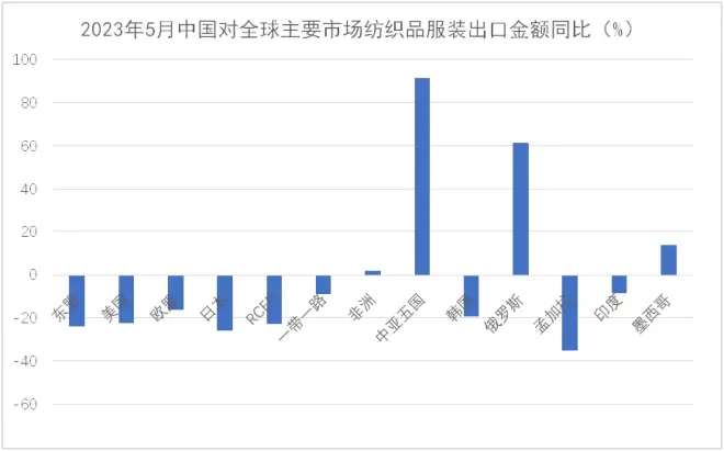 二、市场结构变化仍在继续,一带一路沿线国家和非洲等非传统市场成为出口重要推动力传统发达市场需求走弱、库存消化缓慢仍是当前我国纺织服装出口面临的主要困难。在3月、4月消化完年初积压订单后,5月我对欧美日等传统市场出口再次出现较大幅度下滑,拖累我纺织服装整体出口。5月单月,我对美国、欧盟27国和日本出口同比分别下降22.2%、15.9%和25.5%,均超13.1%的整体降幅。欧美在我出口市场中所占份额也从去年的31%降至今年前五月的27.4%,下降了3.6个百分点。同时,欧美需求不振也导致我中间品对东盟出口增长动能不足。5月,我对东盟出口同比下降23.7%。与上述四大市场形成鲜明对比的是,5月我对中亚五国、非洲国家、俄罗斯和墨西哥出口保持增长,涨幅分别达91.5%、2.1%、61.4%和14%。值得一提的是,1-5月我对非洲国家累计出口105.1亿美元,同比上涨13.3%,非洲国家占我出口市场的份额提升至8.9%,1-5月我对加纳、塞内加尔、阿尔及利亚、安哥拉等国的出口增幅超过40%,在有海关统计的50多个非洲国家中,我对逾40个非洲国家出口保持了增长,非洲国家成为我纺织服装出口的重要增长点。