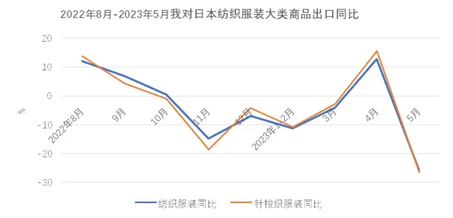 东盟—受欧美需求下降的传导影响,我对东盟出口增长动能减弱。5月我对东盟出口同比大幅下降23.7%,环比下降13.5%。其中中间品纱线面料下降25.9%。1-5月累计对东盟出口下降3.9%,其中纱线面料合计出口下降14.1%,服装出口增长18.9%。美国—对美出口继续下跌。5月对美出口延续跌势,且跌幅有所扩大,从上月的5%扩大到本月的22.2%。重点商品针梭织服装当月出口量价齐跌,金额同比降幅由上月的9%扩大至24%,其中出口量同比下降21%,出口均价微降3.7%。1-5月我对美累计出口179.5亿美元,下降16.7%,其中针梭织服装合计出口下降16.2%,主要是出口量下降21.4%,出口均价保持6.6%的上涨。欧盟—对欧盟出口延续跌势,5月同比降幅由上月的6.2%扩大至15.9%。但在四大重点市场中,本月欧盟降幅最低。其中大类商品针梭织服装出口下降18.5%。与美国略有不同的是,对欧盟针梭织服装出口额下降更多地是由于价格下降所致,当月出口价格下跌11.1%,出口数量下降8.3%。1-5月对欧盟累计出口144.2亿美元,下降19.3%。大类商品针梭织服装合计下降20%,出口量和均价分别下跌12%和9.1%。日本—在4月实现去年11月以来唯一的月度增长之后,5月我对日出口重回跌势,当月出口同比下降25.5%,在四大重点市场中跌幅最大。其中大类商品针梭织服装出口下降26.3%,出口量同比下降23.3%,出口单价下降3.9%。1-5月,我对日本累计出口69.7亿美元,同比下降8.3%,其中针梭织服装出口下降7.4%,出口量下降3.9%,出口均价下跌3.6%。