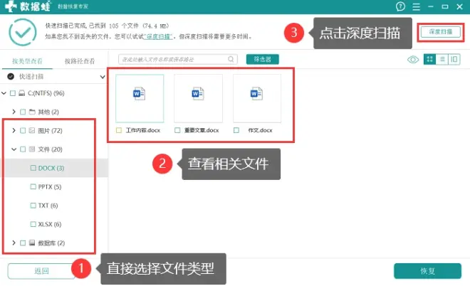 3.扫描需要时间,等待扫描结束,可以直接找到文件的类型,并在界面右侧对文件进行选择,如果没扫描到相关文件,可以点击【深度扫描】,在获得更齐全的扫描结果后再次进行选择;