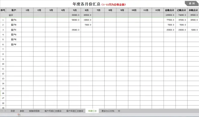 最后,系统会根据以上销售数据在客户月度、年度汇总查询表及年度各月份汇总表中自动生成每位客户每种产品每天、每月的销售情况及每位客户各个月份的应收合计、已收合计和未收合计。