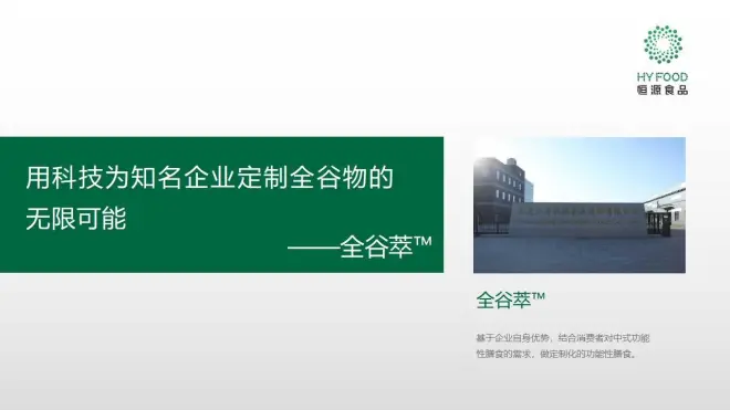 2018年,恒源食品斥资2.5亿元引进,多套瑞士BUHLER(布勒)集团的生产设备,由瑞士布勒全程参与设计建设,是瑞士布勒在中国唯一一条全产业链生产线。依托先进的技术,全谷物的背景优势以及独特的配方设计,恒源食品为全谷物代餐市场注入了新的血液和活力,恒源食品可供应的超微谷物粉、膨化颗粒等系列产品丰富多样,涵盖了熟化/膨化的燕麦粉、藜麦粉、荞麦粉、豆乳粉、黑豆粉、绿豆粉、红豆粉、薏米粉、大米粉、糯米粉、玉米粉、黑米粉、糙米粉、紫米粉等。广泛用于代餐行业的每个品类。在普遍的代餐粉之上,更具营养物质和谷物香气。此外,产品应用范围还扩展到茶饮行业、冰激凌、固体冲调饮料、婴儿食品、保健食品、乳制品、调味品等众多食品领域。