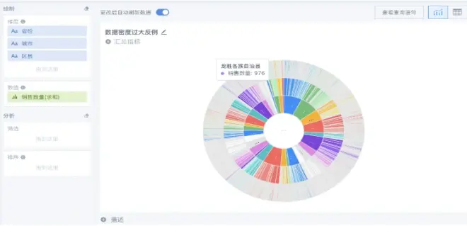 3、可根据需要拖入维度字段和一个数值字段,建议维度字段不要过多,两个图表展示效果最佳,以下图为例,旭日图对比年、季度的销售数量,内层包含外层;
