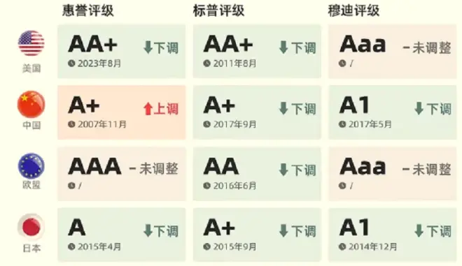 活久见,我们竟然看到了美国信用评级被下调。国际评级机构惠誉8月1日将美国长期外币发行人违约评级从AAA下调至AA+,这是美国历史上第二次信用评级遭下调。而上一次还是在12年前。
