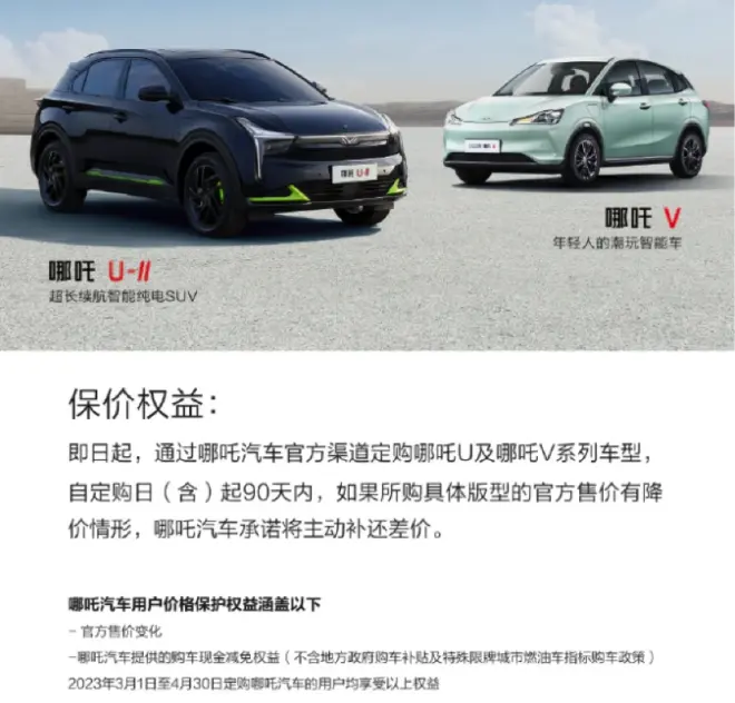 哪吒汽车宣布,3月1日至4月30日期间定购哪吒汽车的用户,如所购具体版型出现官方售价下调或由哪吒汽车官方提供购车现金减免等降价行为,哪吒汽车承诺将主动补还差价。