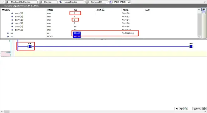 添加如下程序,建立一个%mw0开始的数组,和%qx100.0的开关量,下载后调试