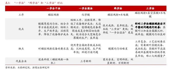 复合铜箔的生产方式主要有“一步法”“两步法”和“三步法”,目前“两步法”使用最广泛。“一步法”分为一步全干法与一步全湿法。1)一步全干法:指仅利用磁控溅射方式镀铜,效率高但对设备要求高;2)一步全湿法:指仅利用化学镀的方式沉积铜膜,所获得的复合铜箔良率高同时无“边缘效应”,但有效率低和污染问题;3)“两步法”为磁控溅射+水电镀,首先通过磁控溅射在塑料薄膜表面镀上一层金属层,使其能够导电,其次再通过水电镀的方式加厚金属层,技术成熟,成本较低,目前使用最广泛;4)“三步法”:针对二步法磁控溅射后不平整的问题进行改善,在磁控溅射后进行真空蒸镀最后进行水电镀,利用蒸镀加速金属层的沉积,效率高,但是工序复杂且成本高、良率低,使用少。