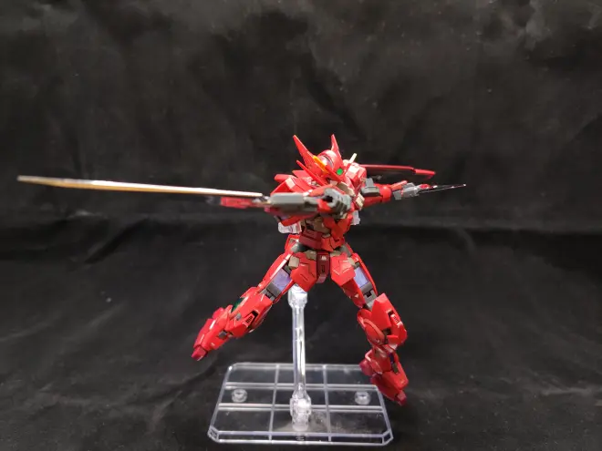 大腿处红色零件拉出来,可以翻出挂载点用来挂GN步枪、GN剑等武器,挂载之后会和腰后的GN光束军刀剑柄产生一定的干涉,总之玩起来就是怪怪的