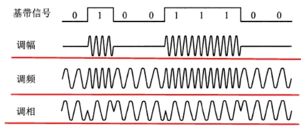 带通调制:将基带信号的频率范围转换为另一频段,并化为模拟信号。