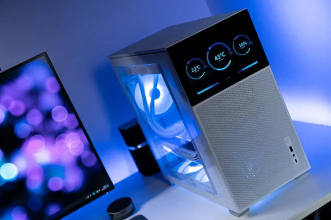 作为D31的升级版本,D41增加了对ATX的安装支持,整体外观除了高度以外基本和D31一致,正面是一块8英寸的屏幕,可搭配AIDA64显示运行状态货设置成动态壁纸。下部分则为mesh面板,进一步加大了通风效率。从背面可以看到,D41在最下面的PCI-E挡板上预留了HDMI及TYPE-C线缆的过线孔。