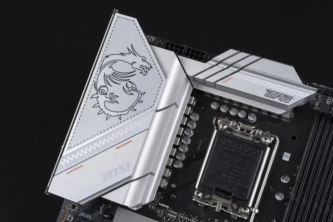 微星MPG Z790 EDGE WIFI DDR4 主板的VRM散热装甲两个超大的金属散热鳍片通过铜管链接,并在MOS管上方也配备了7W/mK的高效导热垫。VRM的上的龙形LOGO支持ARGB和主板同步灯效。