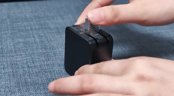 值得注意的是,QCY氮化镓65W充电器采用90°可折叠插头设计,在不使用时将插头折叠起来,使整个充电器更加紧凑,出差或者在路上的时候可以将充电器放入行李包中的小隔间或口袋中,不会占用太多宝贵的空间,可以说是相当实用了。