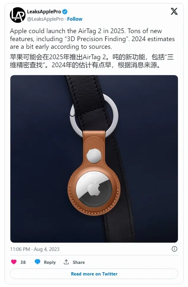 LeaksApplePro 表示,苹果会在 2025 年推出 AirTag 2 追踪设备。他在推文中表示,此前诸多消息源称苹果在 2024 年推出 AirTag 2 的时间有点太早了,更准确的时间应该是在 2025 年。