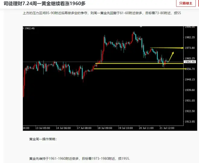司徒理财7.24黄金1960多已盈利,黄金午后1966下落空