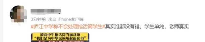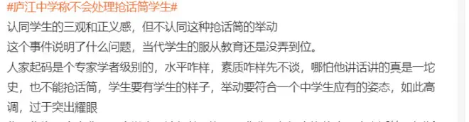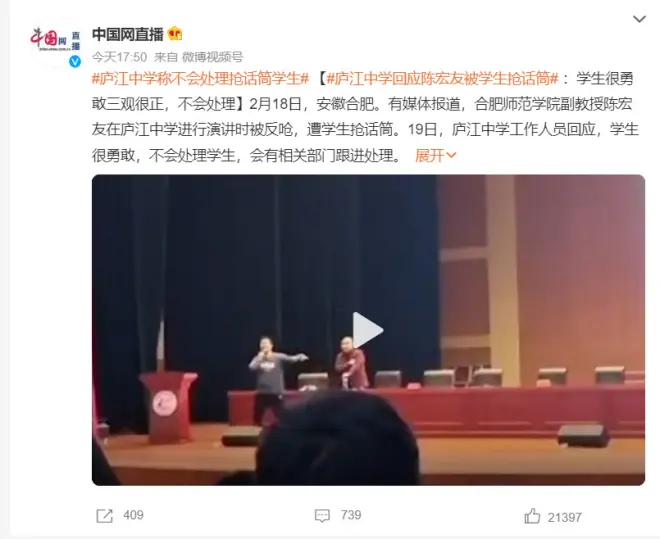 今天的新闻,现在在热搜第一挂着,题目叫“庐江中学称不会处理抢话筒学生”。
