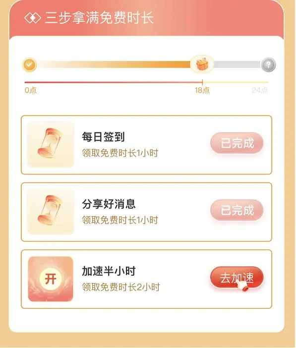 新增免费时长会在0点-16点后自动延长。如果完成上面全部3个任务,每天最多可解锁0点-20点整整20个小时免费时长。