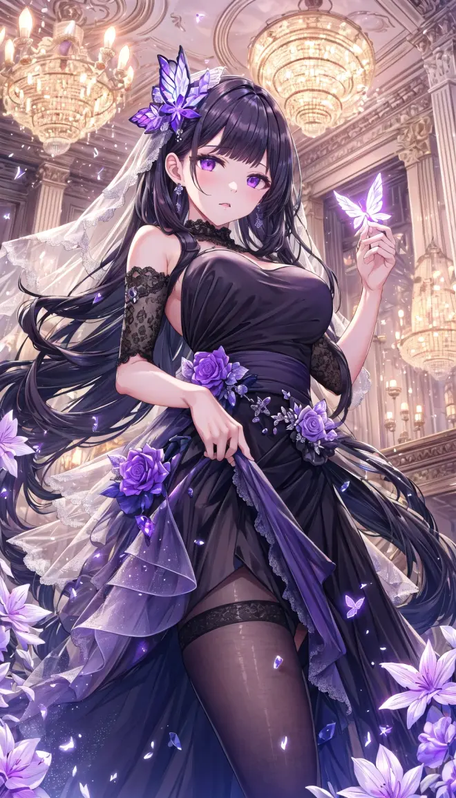 (solo), (1girl), standing, fatness, Black hair, long hair, straight hair, (asymmetrical bangs:1.3), hair_over_breasts, *//*, light purple eyes, *//*, Long light_purple dress<(flowers:0.8)>, Silk stockings,