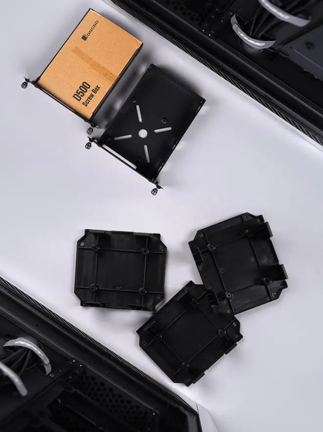 下方预装了两个 3.5\2.5 寸硬盘复合安装支架(3.5\2.5 二选一安装),手拧螺丝设计方便拆装,上头的面板亦支持 2.5 寸硬盘安装。