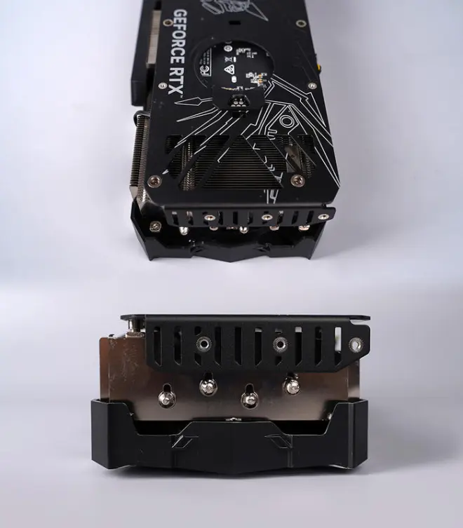 背面标配金属背板,采用高强度合金材料一体铸形而成,增加显卡结构强度,有效保护 PCB,提升显卡静电防护能力,表面双翼元素图案装饰,对应两个卡槽,可以插入包装内随附的两个 RGB 小风扇为显卡辅助散热,下方 ZOTAC 和 GEFORCE RTX 字样。