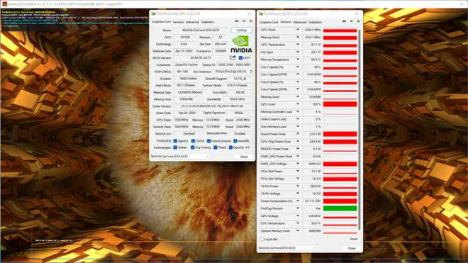 FURMARK 满载测试,过程 20 分钟左右,索泰 GeForce RTX 4070 12GB 天启 OC, GPU 频率 2085MHz,显存 1312MHz ,核心温度 67.1 度(结温 83.1 度),显示功耗 210W 左右。