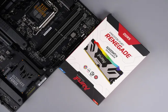 搭配内存选用的是金士顿 FURY Renegade 叛逆者系列 ARGB DDR5 6000 16G×2,包装正面印刷有内存本体展示,搭配本体的线条图案修饰,FURY LOGO,对应的规格等信息。