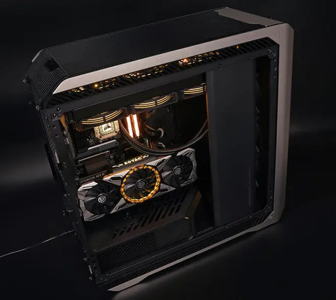搭配显卡索泰 GeForce RTX 4070 12GB 天启 OC,这边为了好看,采用显卡竖立安装,展示出显卡风扇一面外观的金属属性,对应机箱外观!,还能展示到风扇的 ARGB 光圈,增添视觉效果。