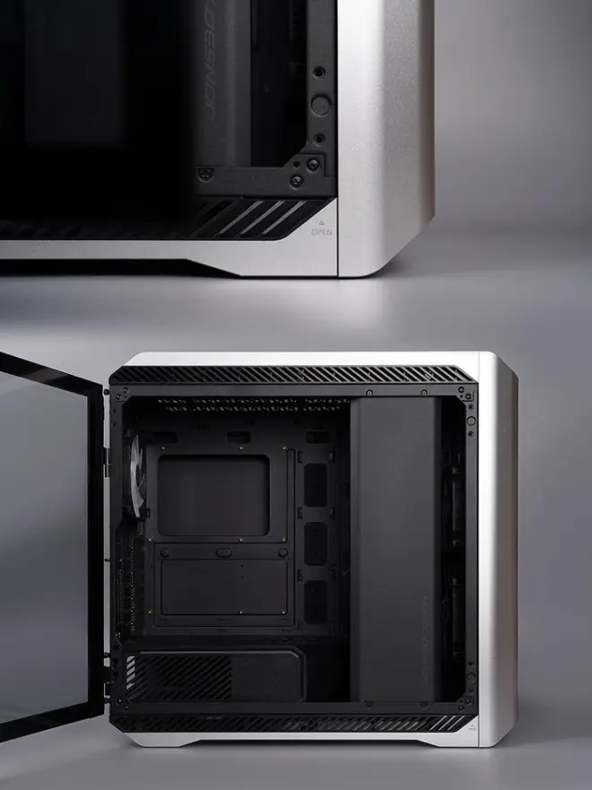 乔思伯 D500 银色款,机箱采用铝合金边框包裹外观设计(外 2.0mm 铝内 0.8mm 钢),全塔 EATX 规格尺寸,具体尺寸 620×586×250mm,重 17.5kg,单面黑化钢化玻璃透侧。