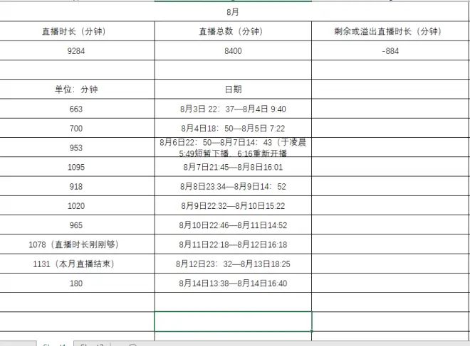 本月剩余十七天,于本日下午16:40分下播。8月14日13:38左右开播,共计3小时2分钟左右!本月剩余直播时长为-14.7小时(以上所有数据均为本人计算,一切以猪油仔真实直播时长为准!),除非有公益直播,否则我们下月见!!!