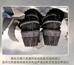 (这里必须要吐槽一点的就是这发动机也太长了吧,都触地了) 这两台矢量发动机可以说是非常瞩目,在海报里说这是变循环发动机,变循环发动机是个很有意思的概念。现在喷气式发动机已经有了涡扇式发动机,涡喷式发动机,冲压式发动机很多类型,但这些发动机就各有各的优缺点,有的为了推力牺牲了航程,有的为了亚音速性能放弃了超音速性能,但变循环发动机就是为了解决这些问题才出现的 变循环发动机的原理略微复杂,但对我这种理科废物来说已经和降维打击差不多了,这种东西我一看就头疼,所以简单来讲就是变循环发动机可以根据需求自行变换形态,你想让他省油他就省油,你想让他快他就快。对于航空领域可以说有着革命性意义