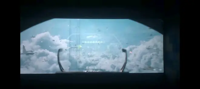 而且平显的图案并不是这么简单的,这种航电方面的知识比较硬核,我也没研究透,因为电影中各国战机都只用了机炮,所以这里就说一下平显的机炮射击模式,在现代平显启用机炮射击时有瞄准点射击模式和瞄准线射击模式,瞄准点射击模式是在平显上显示一个移动瞄准点,将敌机套进瞄准点内就可以直接射击,而瞄准线射击模式则是通过火控计算机算出弹道,弹道会在平显上呈现出一条线,飞行员将线压在敌机上就可以直接射击。下图为歼10C和歼16的军演画面