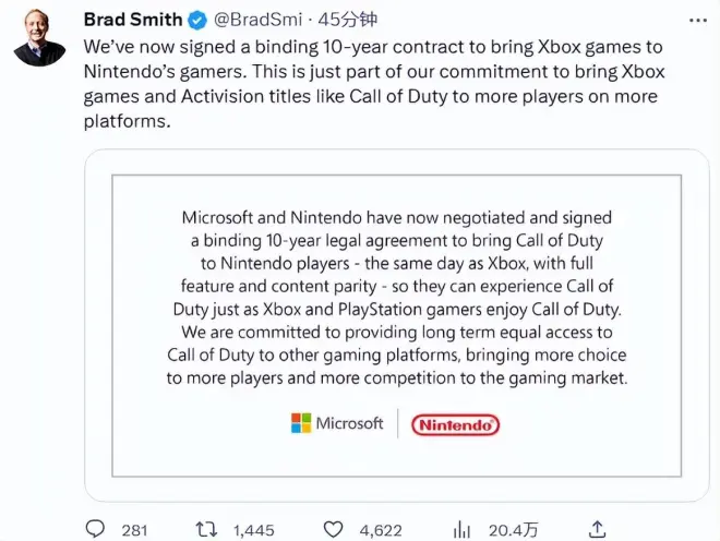 微软总裁Brad Smith 21日发推表示,已经就《使命召唤》与任天堂达成了一项合作。